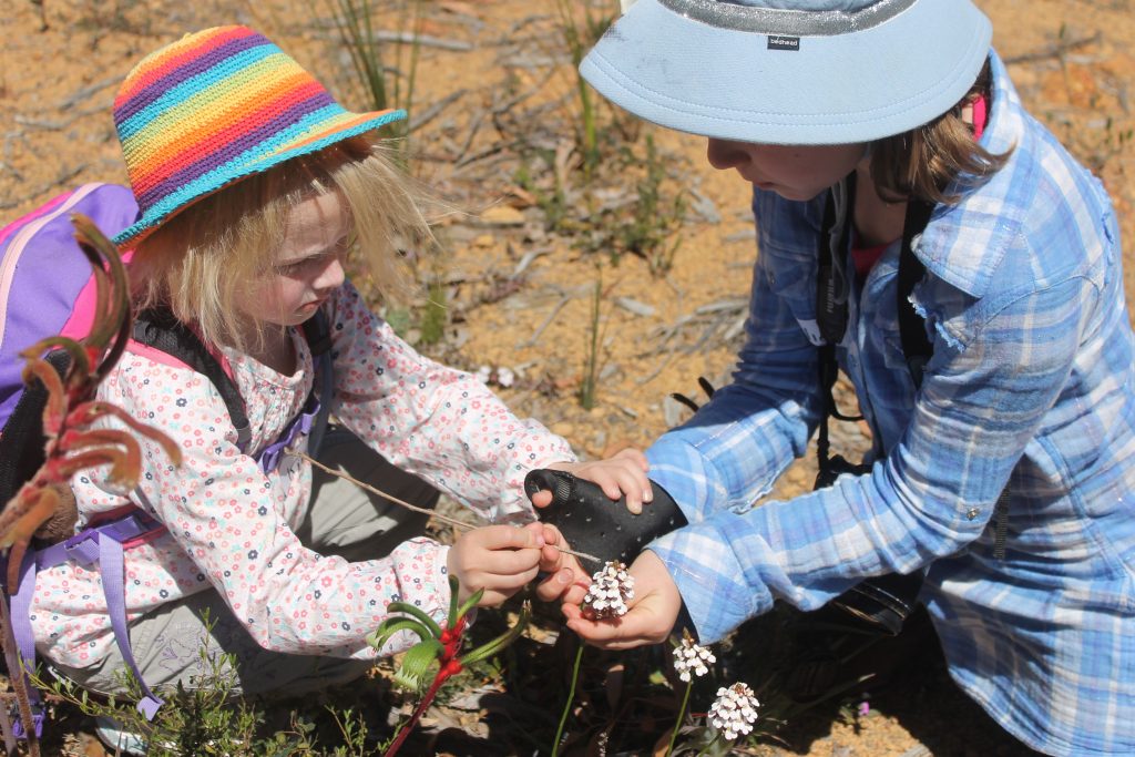 The DRB had invited members of local home-schooling groups to join them on the excursion. We were very disappointed that eleven people who indicated attendance did not turn up, as we had closed bookings because we’d reached maximum numbers. However, of the families that attended, the children learnt about trigger plants for the first time and the many Reed Trigger Plants (Stylidium junceum) captured their attention (above, R Green.)