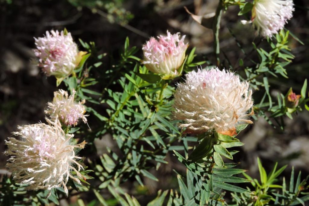We barely had time to look up, but on the rare occasions when we did we watched a male Golden Whistler (Pachycephala rufiventris), in the trees and Rainbow Bee-eaters (Merops ornatus) circling overhead. The Red-tailed Black-cockatoos (Calyptorhynchus banksii) were there again too. When we had barely begun walking we were drawn to many tall stands of pimeleas (Pimelea spectabilis)(below, J Start) just near the car park. The bright yellow of the Yellow Flags (Patersonia umbrosa var. xanthina) were also appreciated and Lynda Tomlinson explained about the male and female forms of the False Boronia (Phyllanthus calycinus) that we saw.