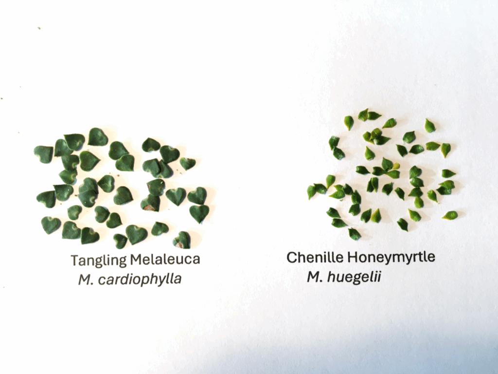 As only one person came prepared to snorkel it was decided we would instead walk along the coastal path to examine the various plant communities. At our first stop we examined the leaves of Tangling Melaleuca and soon guessed why its botanical name is M. cardiophylla. (cardio from Latinized form of Greek kardia “heart,” and phylla, meaning leaves in Greek). Further along we examined the leaves of the similar looking Chenille honeymyrtle (M. heugelii) to distinguish it from the Tangling Melaleuca.