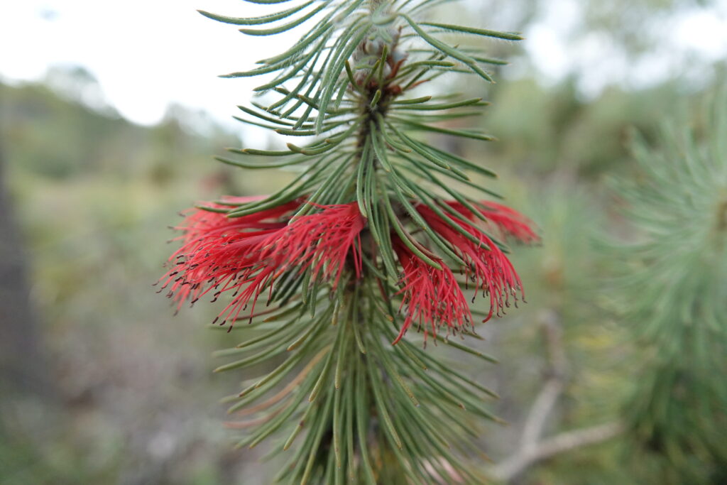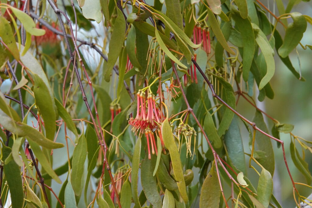 Along the way, we had great views of the dry granite-based waterfall down into the valley and out towards the skyscrapers of Perth CBD. The Wireleaf Mistletoe (Amyema miquelii) was in full flower, and the New Holland Honey Eaters were seen feeding on the nectar produced by the flowers. We could also hear other birds, including Fairy Wrens, possibly a Pardalote, and Australian Ringneck parrots. The only other flowering plants observed were the Marri (Corymbia calophylla), Mouse Ears (Calothamnus rupestris), and the Chocolate Lily (Dichopogon preissii).