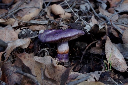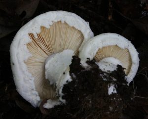 Amanita ?hiltonii (Elaine Davison) Leucopaxillus lilacinus hiding under leaves (Jolanda Keeble)