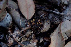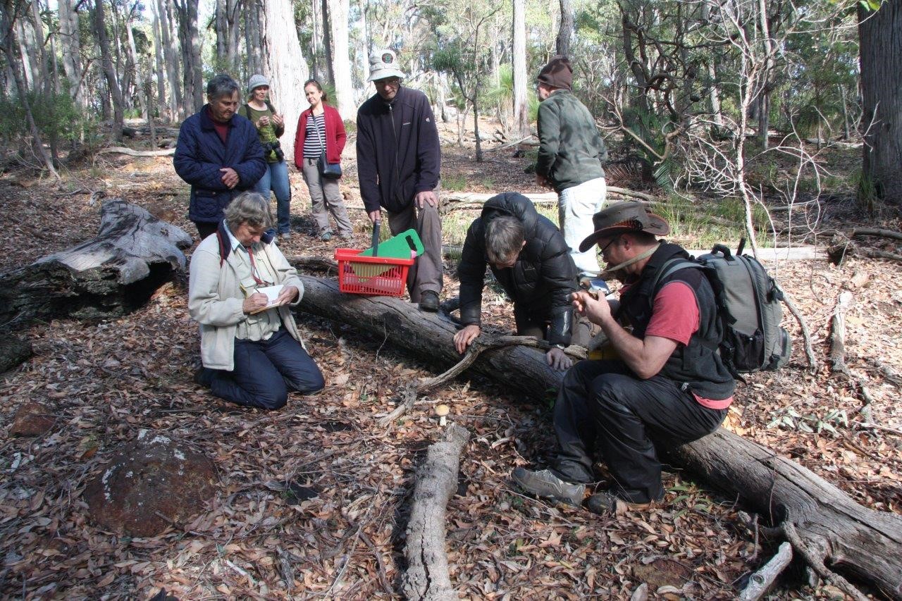 For those readers who have never taken part in a fungi foray, let me explain that it is not for those who enjoy covering a lot of ground. There is a lot of looking closely at the leaf litter to see whether there are any mushrooms lurking beneath; there is log and branch turning to see whether there are skin fungi fruiting on the underside; close attention is paid to Marri nuts and kangaroo dung because there are often tiny cup fungi or minute mushrooms fruiting on them; and if all else fails, there is always scratching around with a truffle rake to see whether there are truffles in the litter or mineral soil. As a result, if collecting is good, some forays move no further than 100 m from the starting point.