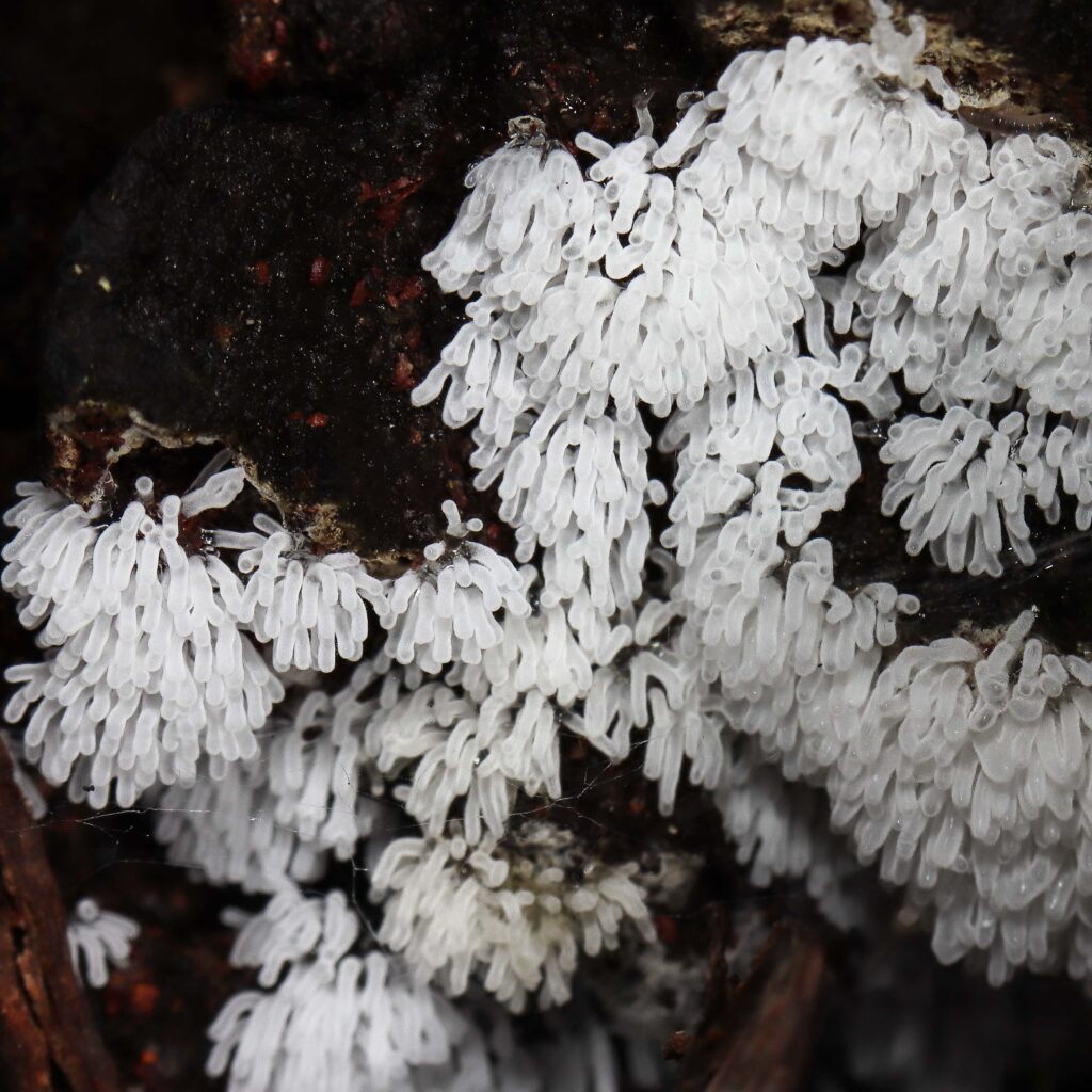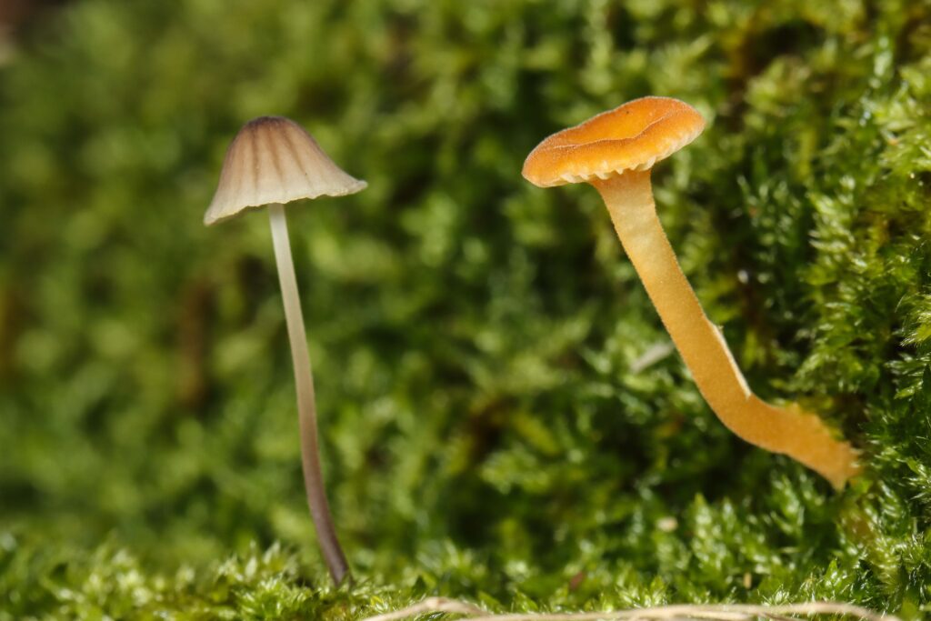 Corinopsis aff. stanglianaIcicle Fairy Fans – Ceratiomyxa fruticulosa Mycena sp. and Orange Mosscap – Rickenella fibula in a bed of moss
