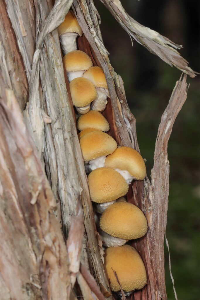 The types of fungi found on the fallen wood included bracket fungi, which includes Royoporus badius, Pycnoporus coccineus (Scarlet Bracket) and Hexagonia vesparia (Wasp Nest Polypore), plus gilled fungi such as Gymnopilus sp., Mycena sp., Resupinatus sp., and a couple of large clusters of Armillaria luteobubalina (Australian Honey Fungus). Elaine explained that although the Honey Fungus is a pathogen and invariably causes the death of the host tree, it does contribute to regeneration by recycling the nutrients it gained from the host.