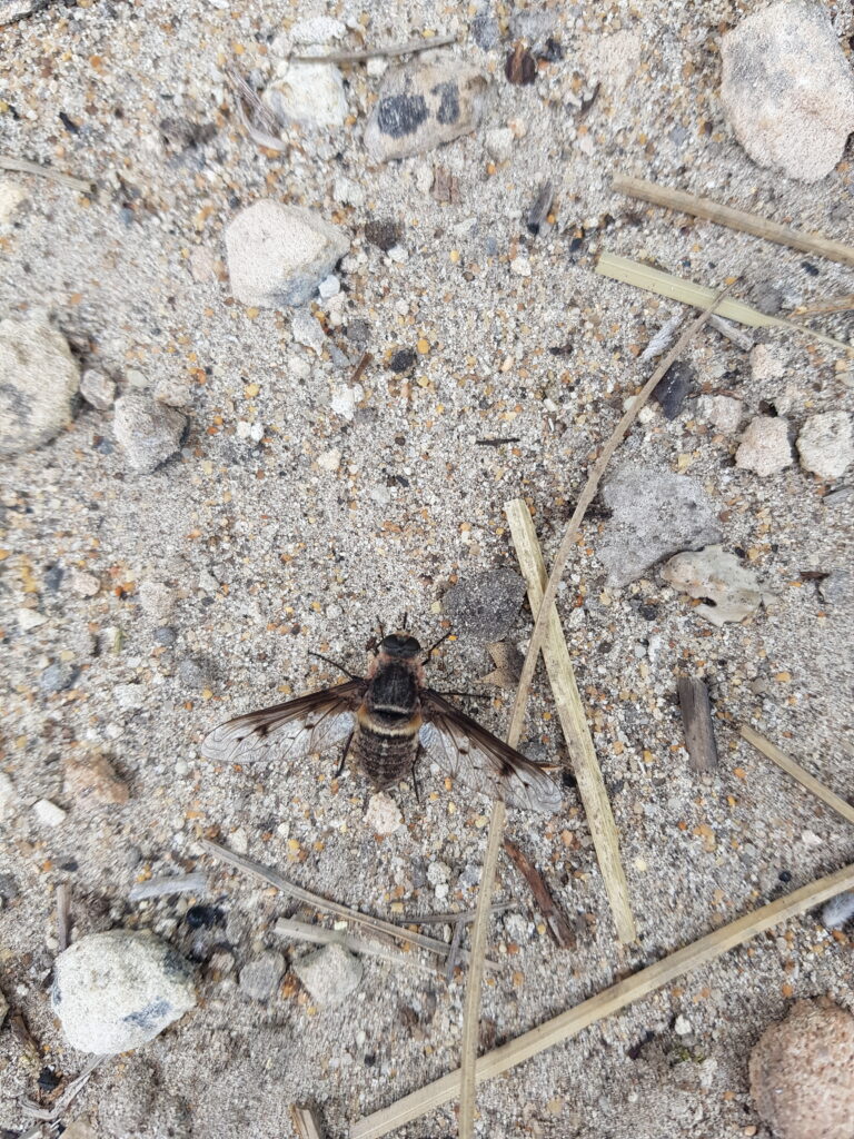 Apart from hearing all about the habits of grasstrees (Xanthorrhoea sp.)—especially in response to a fire such as the arson attack of March 2023 in the reserve—from Prof Lamont, we saw a wide variety of trees, shrubs and ground covers. There are many sizeable Tuart trees in the reserve, an unusual pocket of small Jarrah, plus Marri, Banksia (B. grandis, B. attenuata, B. prionotes), Sheoak (Allocasuarina humilis), Swamp Paperbark, Hibbertia, Jacksonia, Yellow Leschenaultia and patches of bright Yellow Autumn Lilies (Tricoryne elatior). Some of the Banksias were showing post-fire epicormic leaf growth. And the grasstrees certainly didn’t disappoint, especially in the burnt area, where they had developed an abundance of flower spikes. We examined these for native pollinators but found mostly European Honeybees. However, one spike appeared to have a couple of Flower Wasps (Thynninae) high up on it. And we saw a Native Beefly (Oncodosia ampla) basking on the ground near the base of a grasstree.
