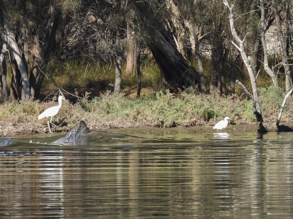 Arriving at the boardwalk that would take us out onto the lake we were a bit disappointed that no Ospreys were found at their usual spot alongside the boardwalk. However, Welcome Swallows flew back and forth over head and Caspian Terns were hunting out over the lake. More spiders were found amongst the Samphire, including a large Banded Garden Orb Weaver. A loud splash drew our attention to the river bank a few hundred metres away. It was made by a lone Bottle-nosed Dolphin that was hunting fish by herding them against the riverbank before launching its noisy attack. We watched it repeat this maneuver several times before it moved further downstream. An Osprey finally made an appearance, gliding slowly overhead, followed shortly after by a Whistling Kite. Pelicans, Australian Shelducks, Grey Teal and Silver Gulls were also spotted flying above the lake.