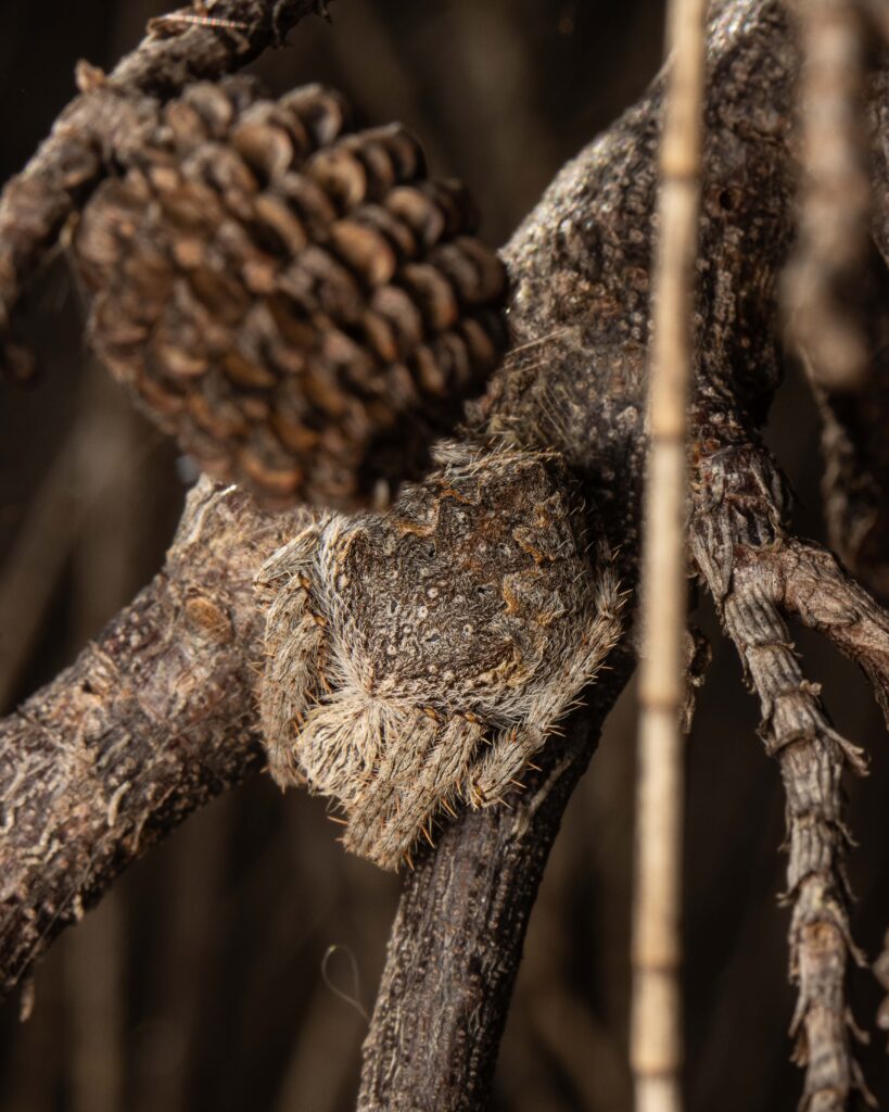 Our walk took us firstly along the Serpentine River where we saw a Yellow-billed Spoonbill foraging along the far bank plus a Great Egret and a White Ibis. Overhead were Little Corellas, Galahs, Red Wattlebirds and Rainbow Lorikeets. Grey Teal, Pacific Black Ducks, Little Pied Cormorants, Little Black Cormorants and a lone Hoary-headed Grebe were on the water while an Australian Darter was seen gliding overhead. As we walked towards the start of the boardwalk the webs of orb-weaving spiders were highlighted by the sunshine. Some webs were made by Leaf-curling Spiders (Phonognatha sp.) while another had a Banded Garden Orb Weaver (Argiope trifasciata) at its centre. A large web was unattended, but Daniel Heald was able to spot its owner, despite its almost perfect camouflage, on a branch of the Casuarina to which the web was tethered. It was a garden Orb Weaver spider (Hortophora sp.).