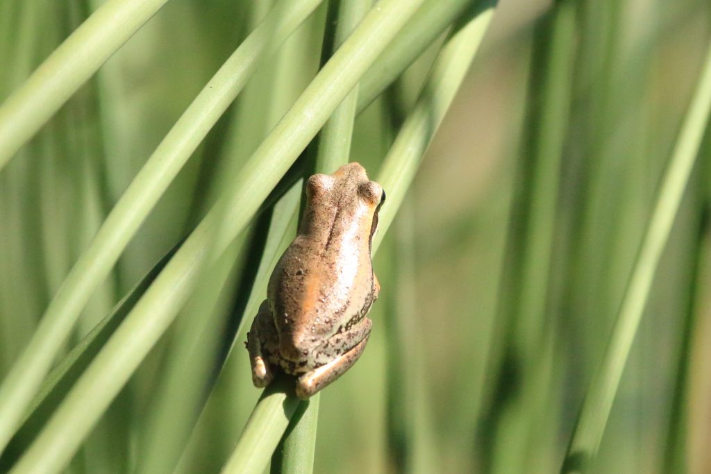 By the time we reached the end of the peninsula which partially separates Popeye Lake from Herdsman Lake, we had seen or heard 19 species of birds. Some observant eyes spotted a small frog on the stem of some rushes bent over the water. Tanya Marwood quickly identified it as a