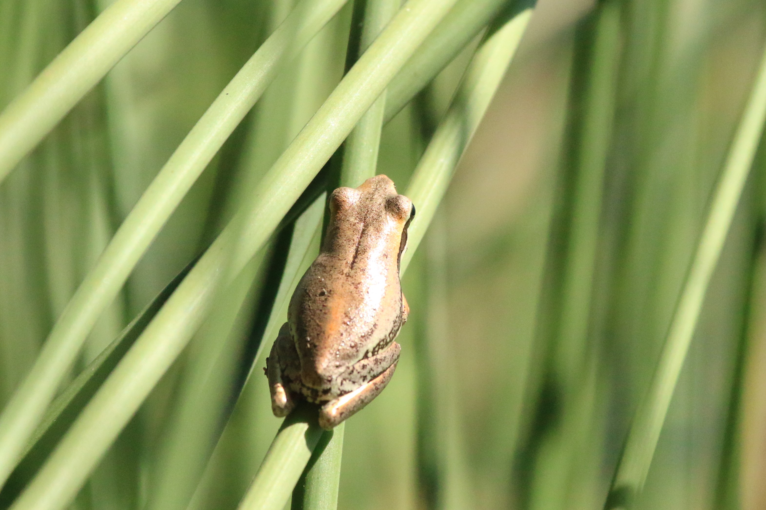 By the time we reached the end of the peninsula which partially separates Popeye Lake from Herdsman Lake, we had seen or heard 19 species of birds. Some observant eyes spotted a small frog on the stem of some rushes bent over the water. Tanya Marwood quickly identified it as a
