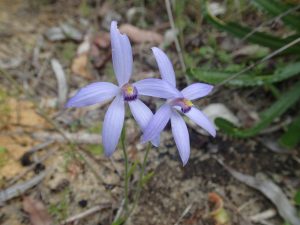 FOWB member Tom Hodgkins had scouted the area the day before and knew where to find several orchid species including two varieties of Greenhoods and some small Blue Beard Orchids (Pheladenia deformis)