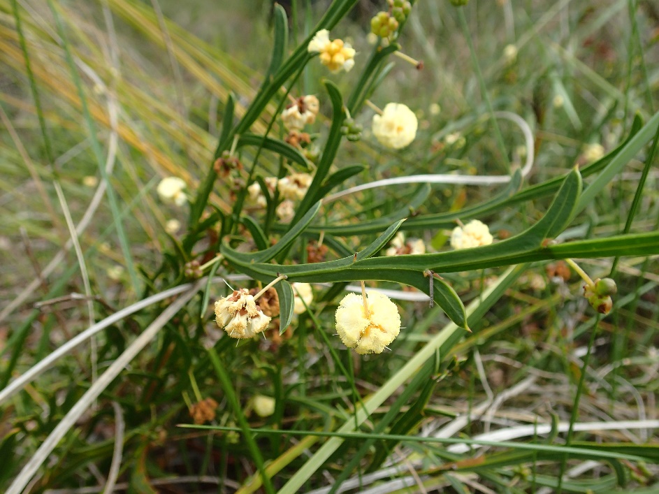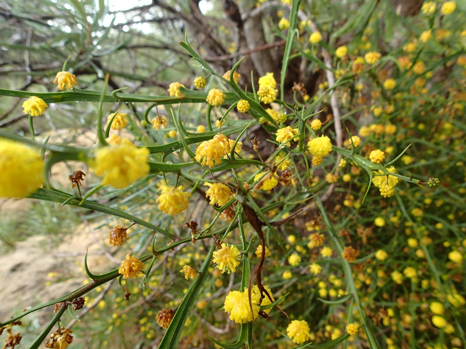 Nats and FOWB member, Karen Clarke, stopped us at a spot where we could see three species of daviesia growing side-by-side; D.divaricata, D. nudiflora and D.triflora. While it was quite easy to see the difference between these three species, it was not the case for the three species of winged acacias we saw; A.stenoptera, A.trigonophylla and A. willdenowiana. The latter, a rapidly spreading native of the Wheatbelt region, has become a pest since being mistakenly planted for the two indigenous species.
