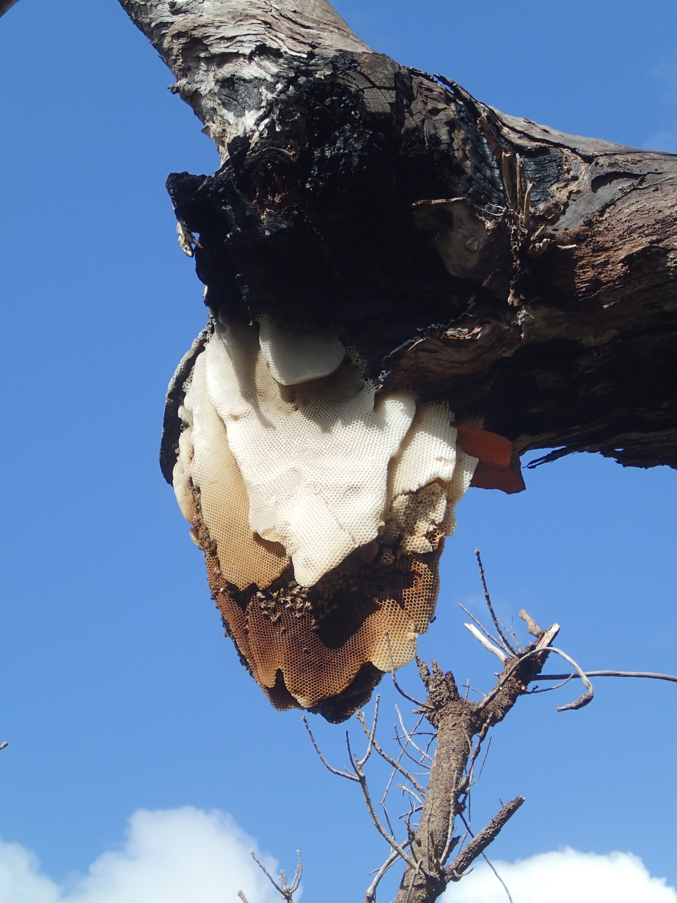 We had several heavy showers while walking which probably accounted for the lack of birds. Too early for the Rainbow Bee-eaters but we did see their ready-made food source—a very large and unusual European bee hive, the pendulous combs being outside rather than inside the branch of a large dead tree.