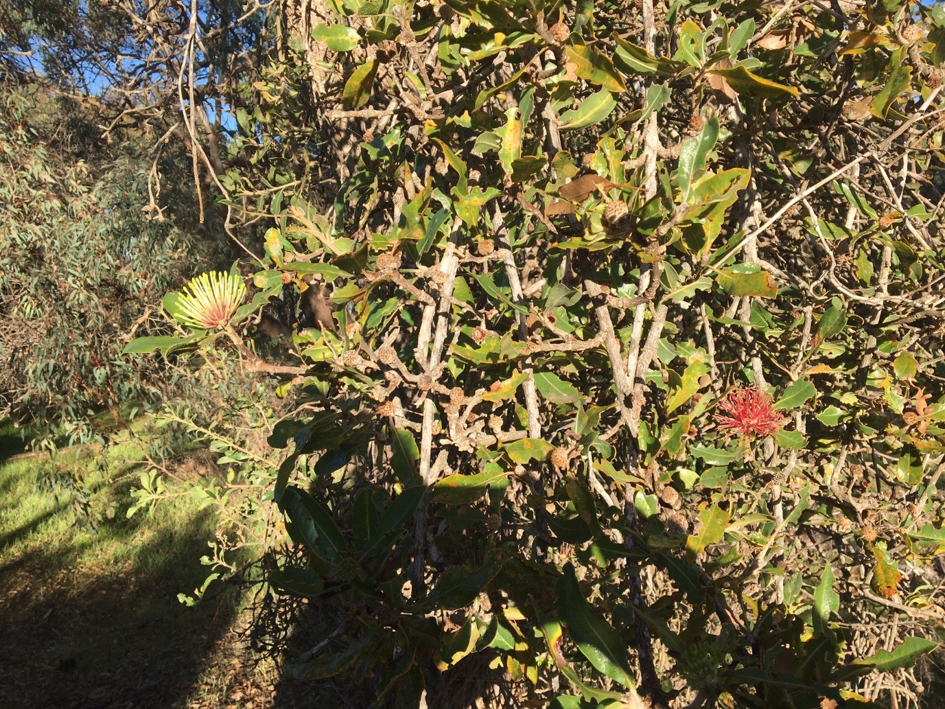 The formal path we followed took us through bushland with an upper story of Flooded Gum, Marri and occasional Jarrah. In places, we came across Swamp Banksias that had just finished flowering and tall Holly-leaved Banksias bearing a mix of juvenile, white-tipped flowers and mature, reddish-pink flowers.