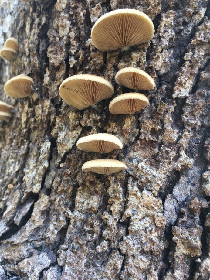 A slime mould, possibly “dog vomit fungus” (Fulgo septica), was found on rotting banksia bark. In contrast, numerous trees were found to have Crepidotus sp. growing over many metres of their trunks. Thick vegetation, mainly paperbark, prevented us from getting close to the lake in most places.