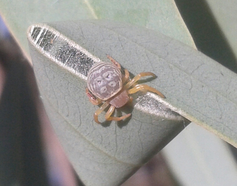 Spiders included a Tetragnathid Long-jawed Orbweaver, a Cymbacha crab spider folding her refuge (see attached), an Argyrodes sp. Teardrop Spider stealing midges from an Eriophora‘s web, and an unusual horizontal orb-web, with complicated stabilimentum, among the leaf litter. Still hoping for an ID on that one. Sightings also included Depressa sp. Lauxaniid fly – unusual beetle-like flies that hold the wings curved over the body like a beetle’s elytra; yellow midges with black spots; grey midges of various sizes in abundance; at least one species of Villa bee-fly, Goniaea Gumleaf Mimic grasshopper nymphs, both grey and orange forms; Acrida conica – Green Slantface, Helea Piedish Beetle; Parosisterna beata leaf beetle; Flea Beetle – Chrysomelidae again, tribe Alticini; and a third unidentified leaf beetle that was walking backwards in circles on a vertical tree trunk. Hyocephalid True Bug nymphs were found under a log.