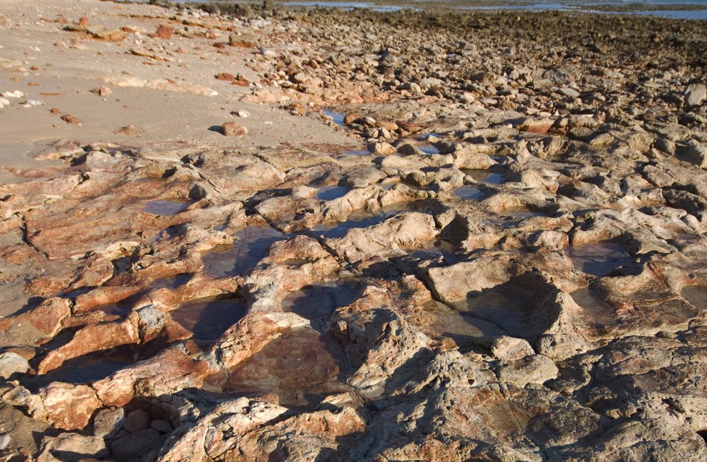 In the 1940s on the Dampier Peninsular near Broome, it was discovered that low tides expose not skeletal material but footprints of three-toed dinosaurs imprinted in the sandstone. Since then thousands more have been discovered, of many types: Theropods, Sauropods, Stegosaurs and Ankylosaurs. Amazingly, the ground has buckled as much as 70cm under the weight of some of these dinosaurs’ feet. Instead of removing the footprints to record them, silicon casts are made in the short time between tides. Also, drones have been used to photograph the trackways.