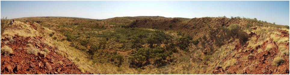 The 270m wide Hickman crater (north of Newman) is partly infilled with alluvium but still measures 30m from crest of rim to floor. A core hole drilled by Atlas Iron on behalf of the GSWA in 2011 in the centre of the crater found 48.4m of alluvium and 6.7m of suevite above the shattered basement. The date of the impact is currently unknown.