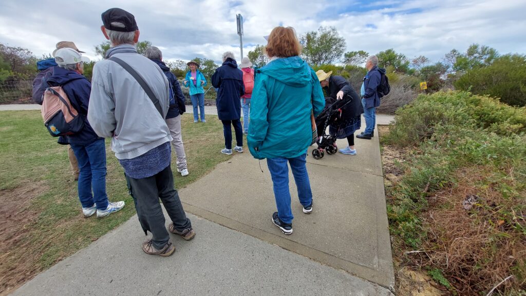 Sue pointed out an area where the group has been encouraging the growth of salt marsh plants such as sedges and samphires. This is a favourite area for wading birds, and a bird hide has been built overlooking it. However, we witnessed people taking their dogs walking along the foreshore, just where the birds feed – a common unfortunate occurrence. Sue said that salt marshes are important in sequestering carbon. As we know, Vlamingh named this river after the black swans, which used to be very common. The decline in numbers is probably because of the decline in the salt marsh along the banks. Among the other interesting points of interest was a layer of shelly limestone at seven metres above sea level, where the sea level had been sometime during the Pleistocene.