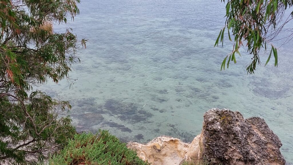 Minim Cove near Point Roe was an important gathering place for the Whadjak Noongar people because of a freshwater spring and a concentration of mullet (which may be attracted by the spring water coming into the river). The people built fish traps which they would herd the mullet into. Sue showed us the submerged rows of rocks that were the remnants of those fish traps, and the area was indeed alive with mullet.