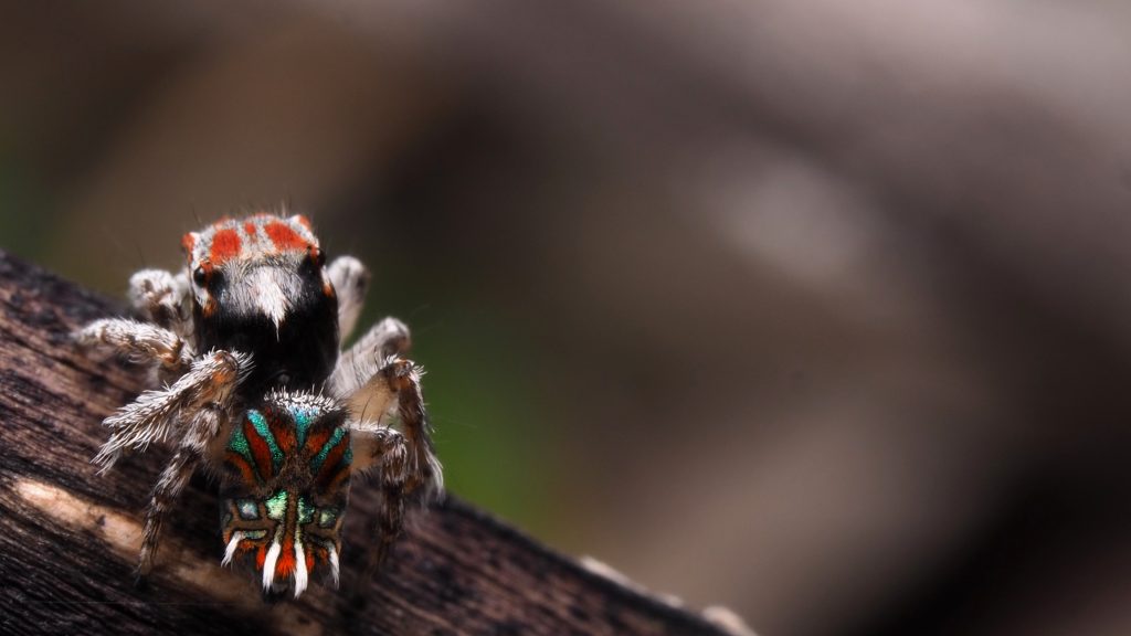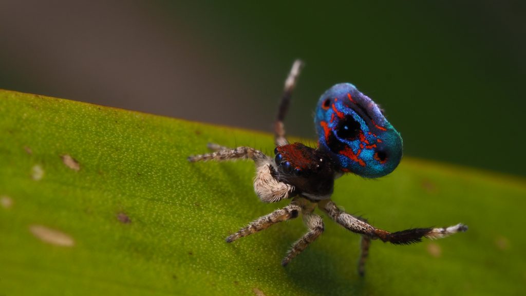 Peacock Spiders (mostly Maratus spp.) belong to the family Salticidae or Jumping Spiders. The genus is endemic to Australia. They are all characterised by having a hardened patch on the back of the abdomen called an opisthomal plate. Some have lateral flaps, some raise their abdomen in display, and some use their legs to “dance”. Like all jumping spiders, Peacock Spiders have eight eyes, good vision and depth perception. The males are colourful, but the females are mostly drab. They only live for a year and go through five moults. It is only after the last moult that the males acquire their bright colours. So, to find a male displaying, it is necessary to look during the period of the last moult, and when there is a female close by.