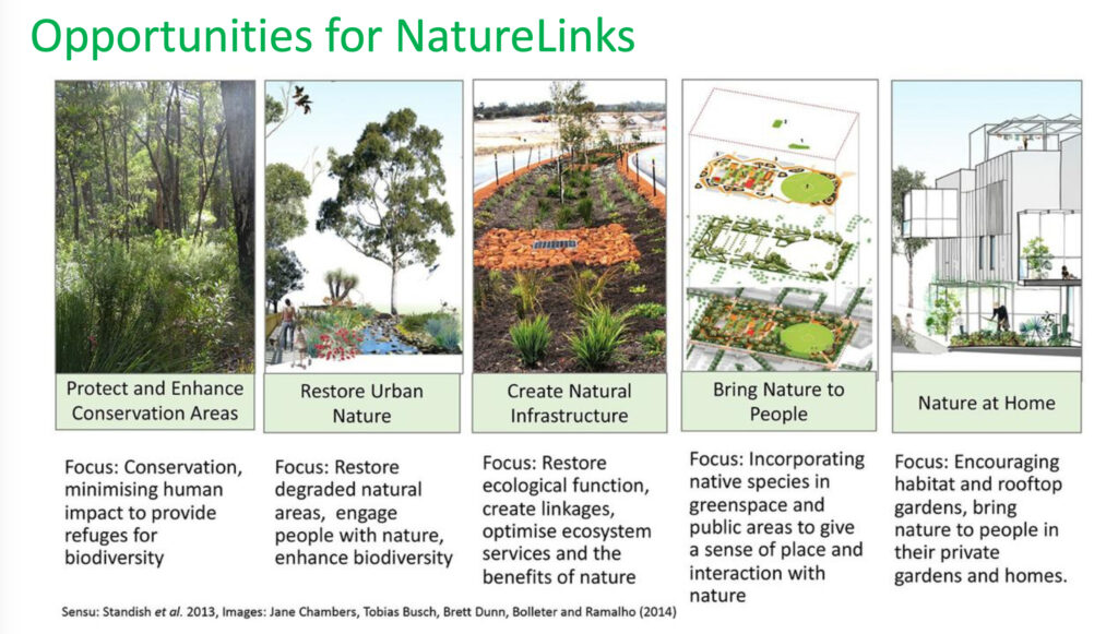 Naturelink Perth details practical ways each of us as individuals, and collectively as organisations, can rewild and revegetate Perth and its environs and protect our precious biodiversity. She showed us how urban design can facilitate species’ movements through urban greening and, especially, by creating linkages between remnant habitats. However, nature links are not corridors of specific width but rather best routes for wildlife.