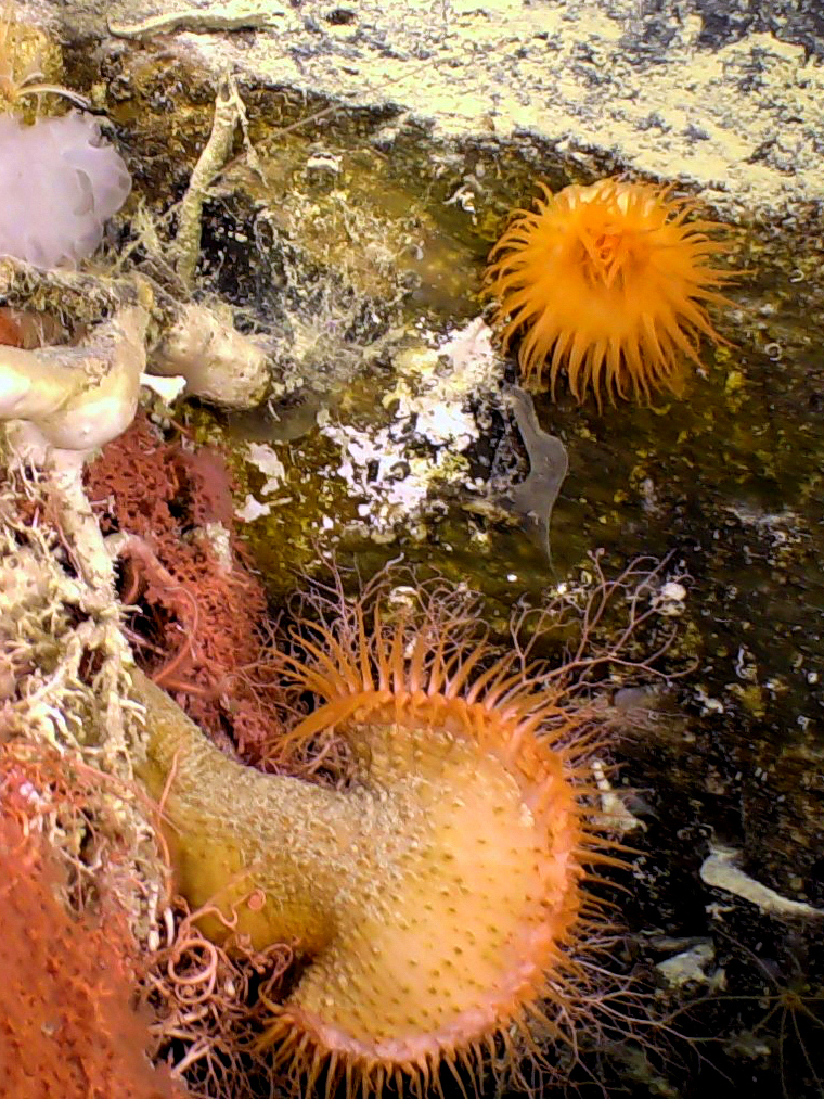Among the biological discoveries were a new species of the bivalve Acesta whose shallow water relatives use flashes as a warning sign, and five new glass sponges, while the Venus flytrap anemone (left, at Perth Canyon, image by UWA) was recorded for the first time along the WA coast.