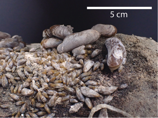 A sample of one of the skulls recovered from 1120m was found to be covered in chemosymbiotic mussels (right, image by UWA), the first such discovery in Australian waters.