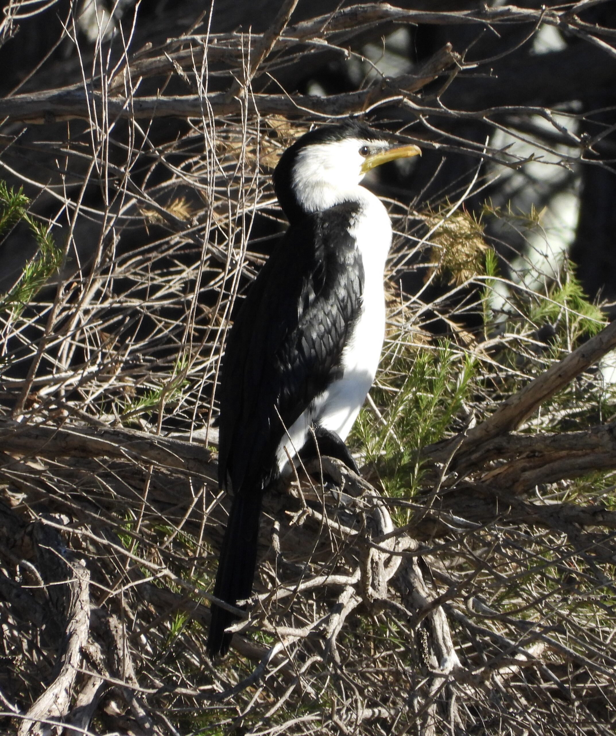 Since the reserve boasts two distinct ecosystems and vegetation types (a large lake with extensive reed beds plus stands of paperbarks and eucalypts) the large number of bird species seen by the group (35) is not all that surprising. But that large number made for exciting viewing for the watchers, a number of whom saw species they had never seen before. Among a couple of dozen Pacific Black Ducks (Anas superciliosa) on the water was a lonely Hardhead (Aythya australis), a pair of Australian Wood Ducks (Chenonetta jubata) and an Australian Grebe (Tachybaptus novaehollandiae). On the far bank was a fine pair of Australian Shelducks (Tadorna tadornoides) along with some odd-looking ducks that nobody was sure about – some hybrid, we wondered. Also in full view was a perfect specimen of a male Australasian Darter (Anhinga novaehollandiae) and a Little Pied Cormorant (Microcarbo melanoleucos), both sitting on dead branches of a tree. The pair of Black Swans (Cygnus atratus) who ever-so-serenely swam by was also a great hit.