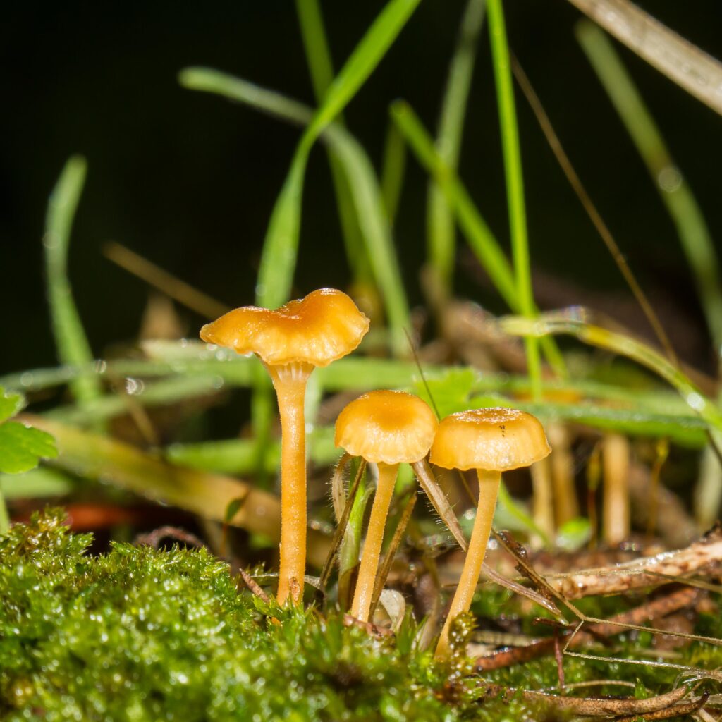As soon as we entered the area, we found lovely groups of Clarke’s Pixie Caps (Mycena clarkeana) and Golden Wood Fungus (Gymnopilus allantopus), and other Gymnopilus sp. on the fallen tree trunks and branches. The tiny Orange Mosscaps (Rickenella fibula) were commonly sighted where moss covered the fallen wood. A few groups of the Australian Honey Fungus (Armillaria luteobubalina) pathogen were also present. We found White Slime Moulds on the underside of the fallen trunks, where there was perpetual shade. In grassy areas, larger gilled mushrooms had emerged, though most were starting to decay, making identification difficult. Our large group was soon spread out (the photographers lagging as usual), so keeping track of all species found wasn’t easy.