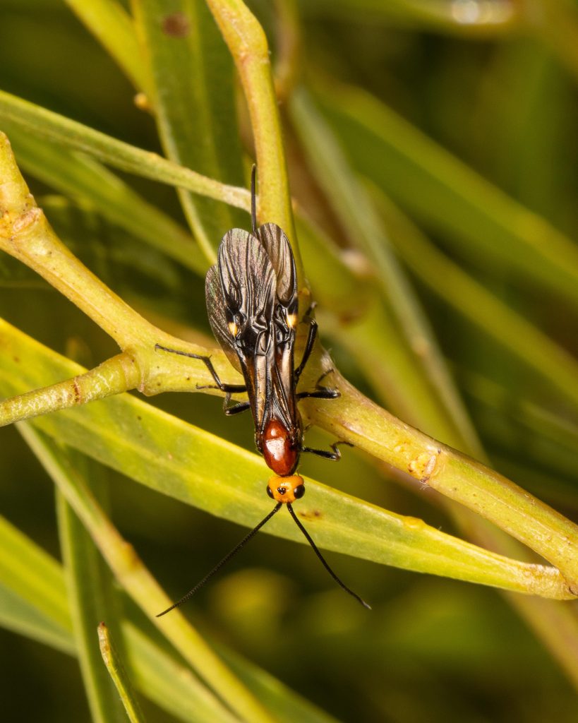 We spotted at least 5 species of wasps, including one of the Thread-waisted Wasps, Family Sphecidae (identified as Prionyx globosus on iNaturalist, but Daniel was unsure if that was correct); lots of Scoliid Wasps (Family Scoliidae) were buzzing around patches of Rhagodia baccata and a wasp from the Genus Callibracon was spotted in an Acacia rostellifera.
