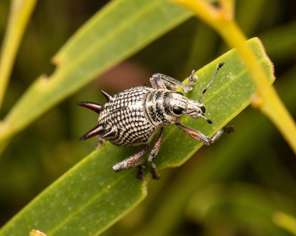 A Blotched Dusky-Blue (Erina acasta) butterfly was a nice sighting amongst the shrubbery. On a nearby Acacia rostellifera, a Catasarcus spinipennis Weevil was spotted amongst the foliage.