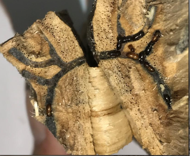 The borer, Euwallacea fornicatus lives in a symbiotic relationship with a fungus, Fusarium species, which infects the xylem of the plant reducing movement of water and nutrients around the plant causing dieback and plant death.