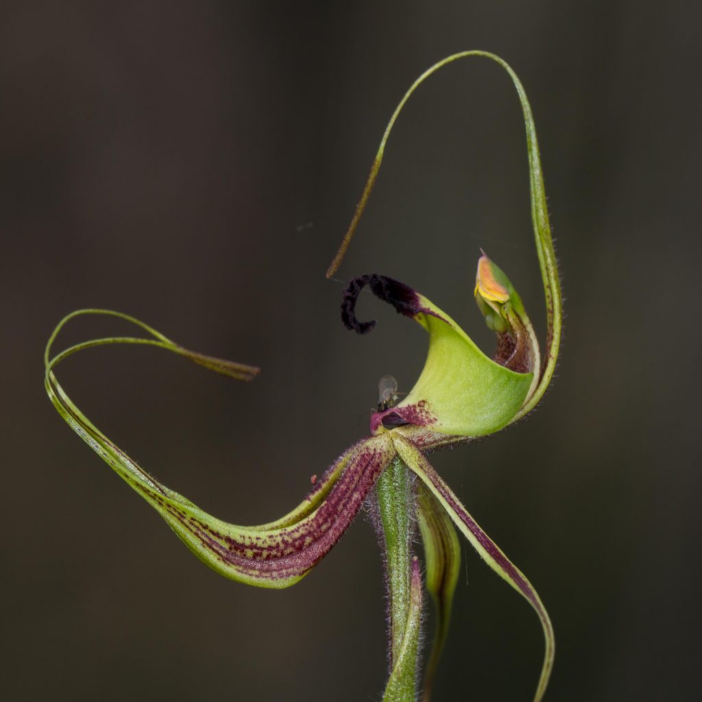 (Caladenia integra)(below left), Carbanup King Spider Orchid, Giant Spider Orchid, Margaret River Spider Orchid, Island Point Spider Orchid, King-in-his-Carriage, Glossy-leaved Hammer Orchid and the Dunsborough Spider Orchid.