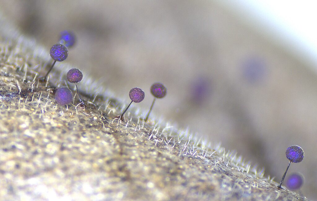 Myxomycetes can be found in most terrestrial habitats, but Karina said that good places to search are in leaf litter, rotting logs, and dark, moist places such as under flaking bark. It is the plasmodium stage which is often visible. It can be quite large, and some are brightly coloured, as are the yellow Dog Vomit Slime Mould Fuligo septica and the Raspberry Slime Mould Tubifera ferruginosa, but in many species, it is very small and hard to find. Karina showed us microscope photos, and many were really beautiful.