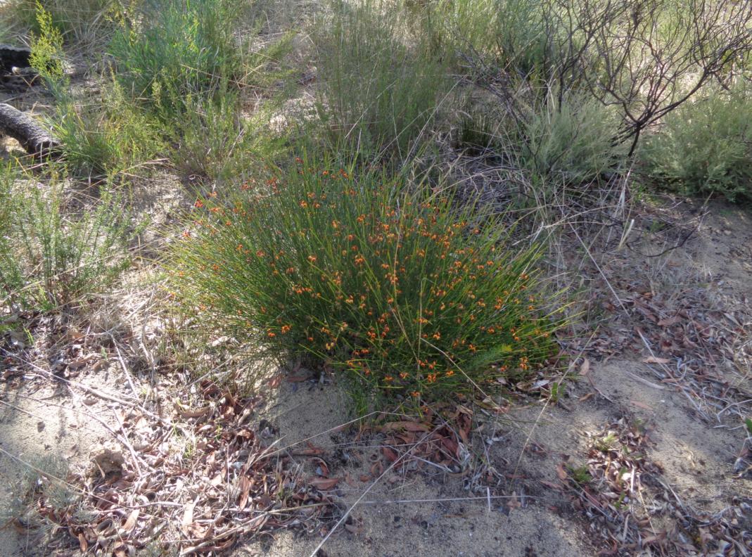 Other early seedlings or quick resprouters include Purple Tassels (Sowerbaea laxiflora), Swan River Myrtle (Hypocalymma robustum), Pearl Flower (Conostephium pendulum), Yellow Leschenaultia, (Leschenaultia linaroides), Blueboy (Stirlingia latifolia), Yellow Buttercups (Hibbertia hypericoides), Yellow Autumn Lily (Tricoryne elatoir) and Daviesia triflora. (below, B. Dixon).