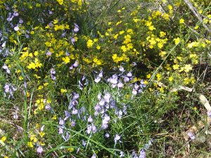 Closer to the ground we saw Yellow Leschenaultia, Native Violet (below left, D Poynton), False Boronia, Grey Scaevola and both the green and grey Cottonheads (Conostylis spp). The Native Wisteria was almost finished but Old Man’s Beard or Native Clematis was quite abundant.