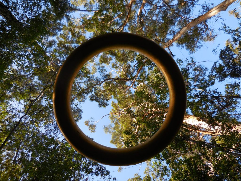 Tuesday 5th emerged as overcast but mild and we duly gathered for the day’s events at 9 am then set off in convoy to climb Mt Franklin. The walk began quite leisurely but the last part was somewhat of a challenge with uneven concrete steps and a metal ladder to the top. Unfortunately there was a strong wind at the top which tended to make your eyes water and the view was somewhat hindered by the overcast day. Notable observations along the way were the Baudin’s Black-Cockatoo, a small pink geranium in flower, a bee swarm and a Hemiandra in flower. Morning tea/lunch was at the brilliant undercover interpretive area before walking around the base of the mountain to the walkway platform and more views. It was then off to Fernhook Falls on the Deep River and the beautiful Rowell’s Pool walk, again with an interpretive undercover area showing us what to expect and where the name came from (a fern-hook was found here.) Lastly we stopped at the Walpole Wilderness Discovery Swarbeck Art Sculpture Loop amongst the towering Karri trees. These sculptures were done by Lorenna Grant and Alan Clark. The reflective wall was impressive with its poetry and information.
